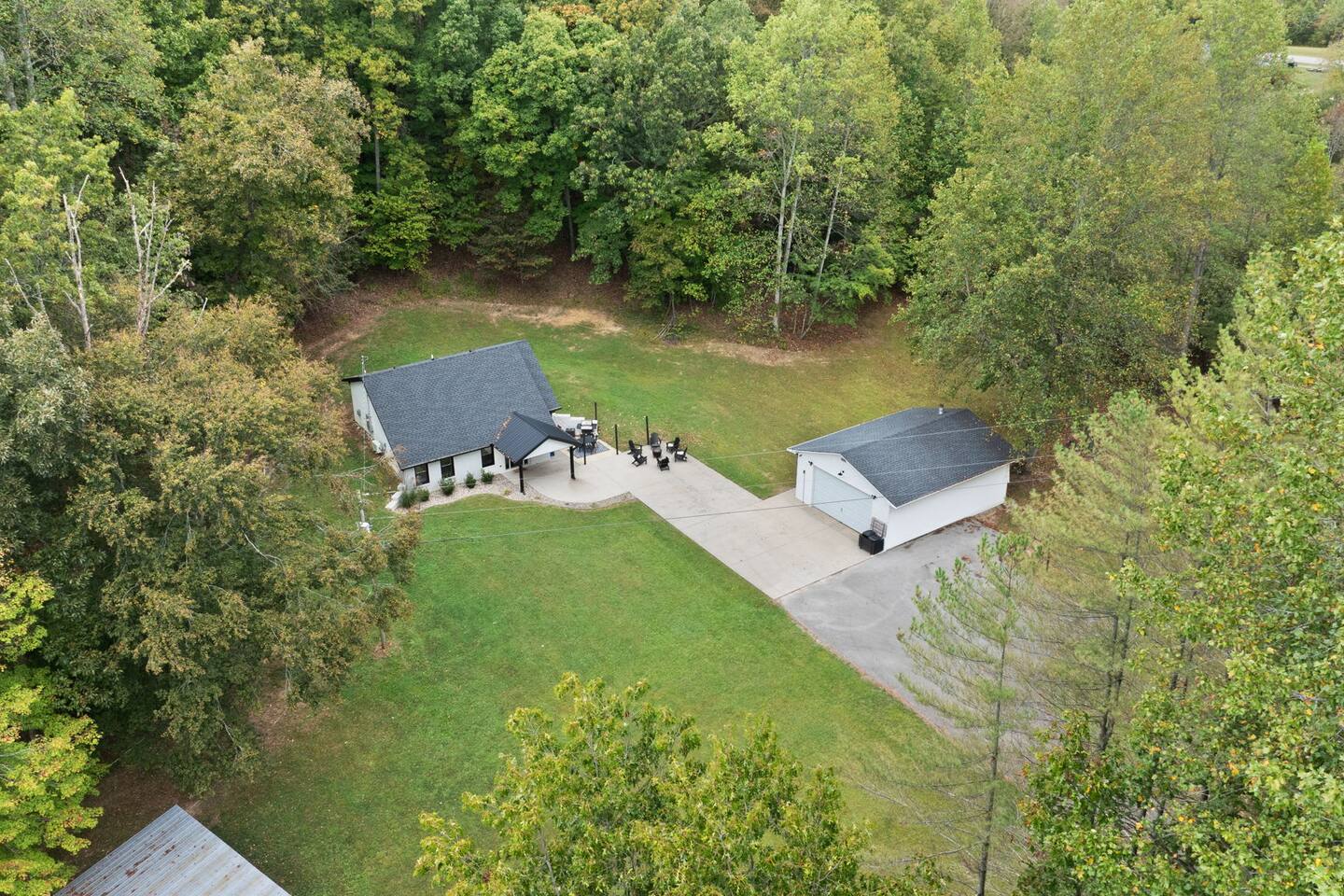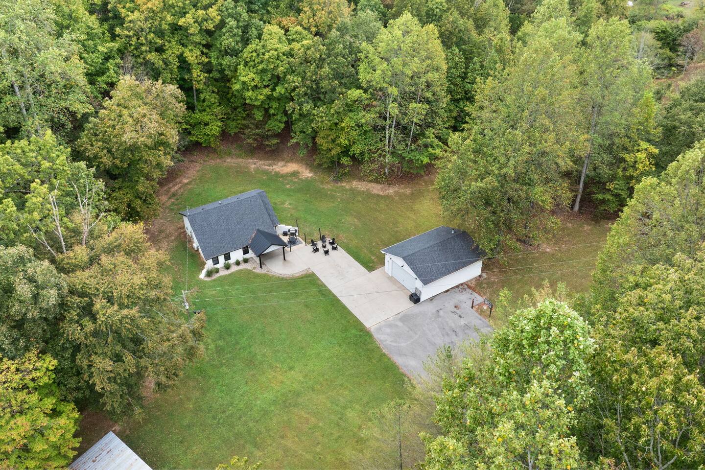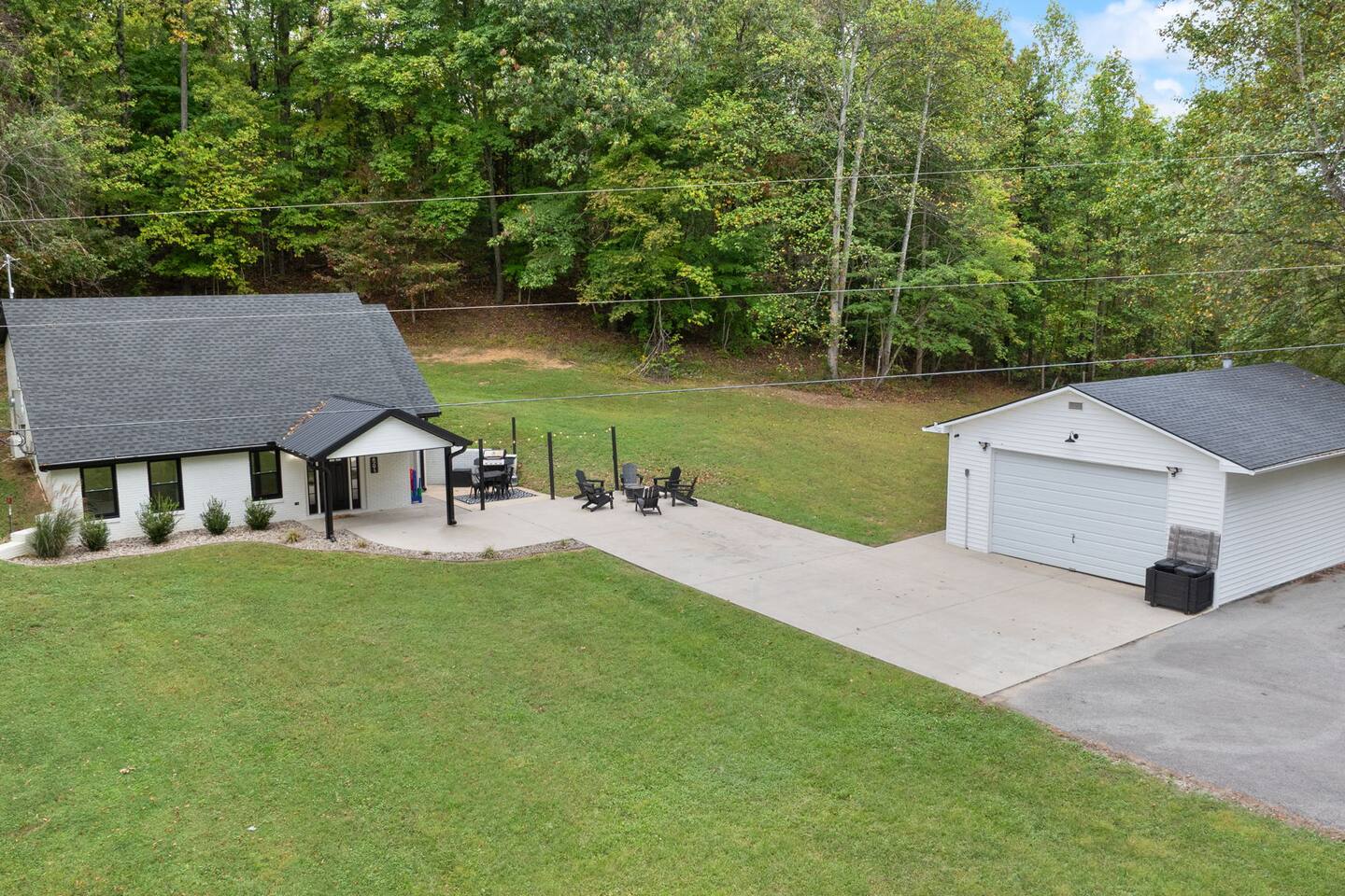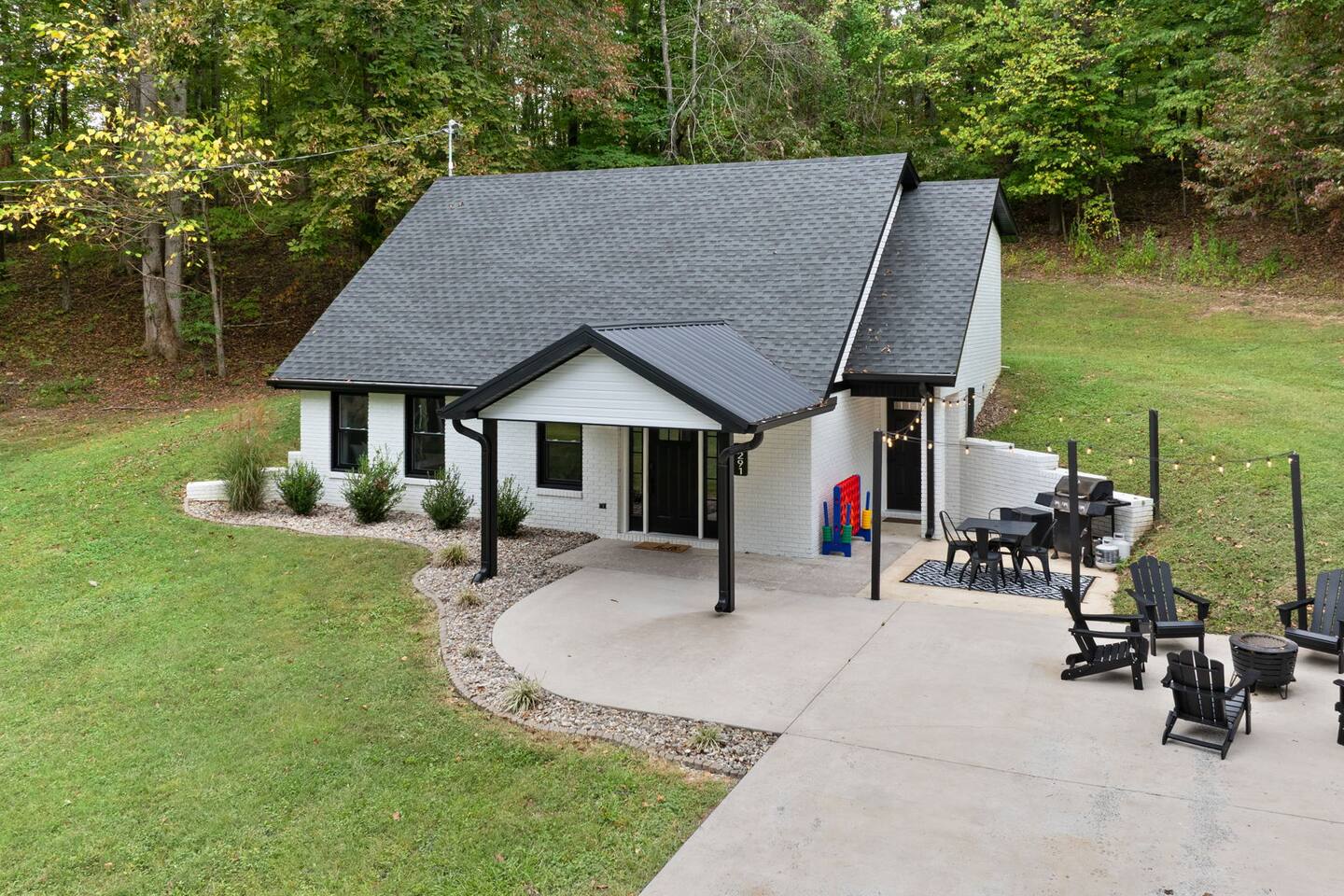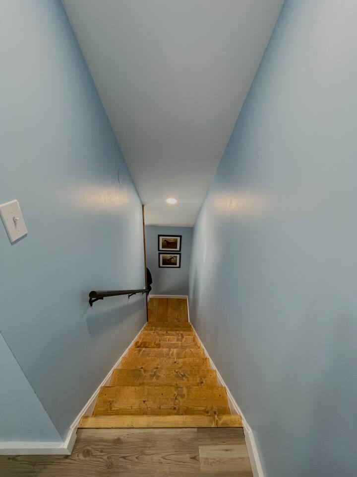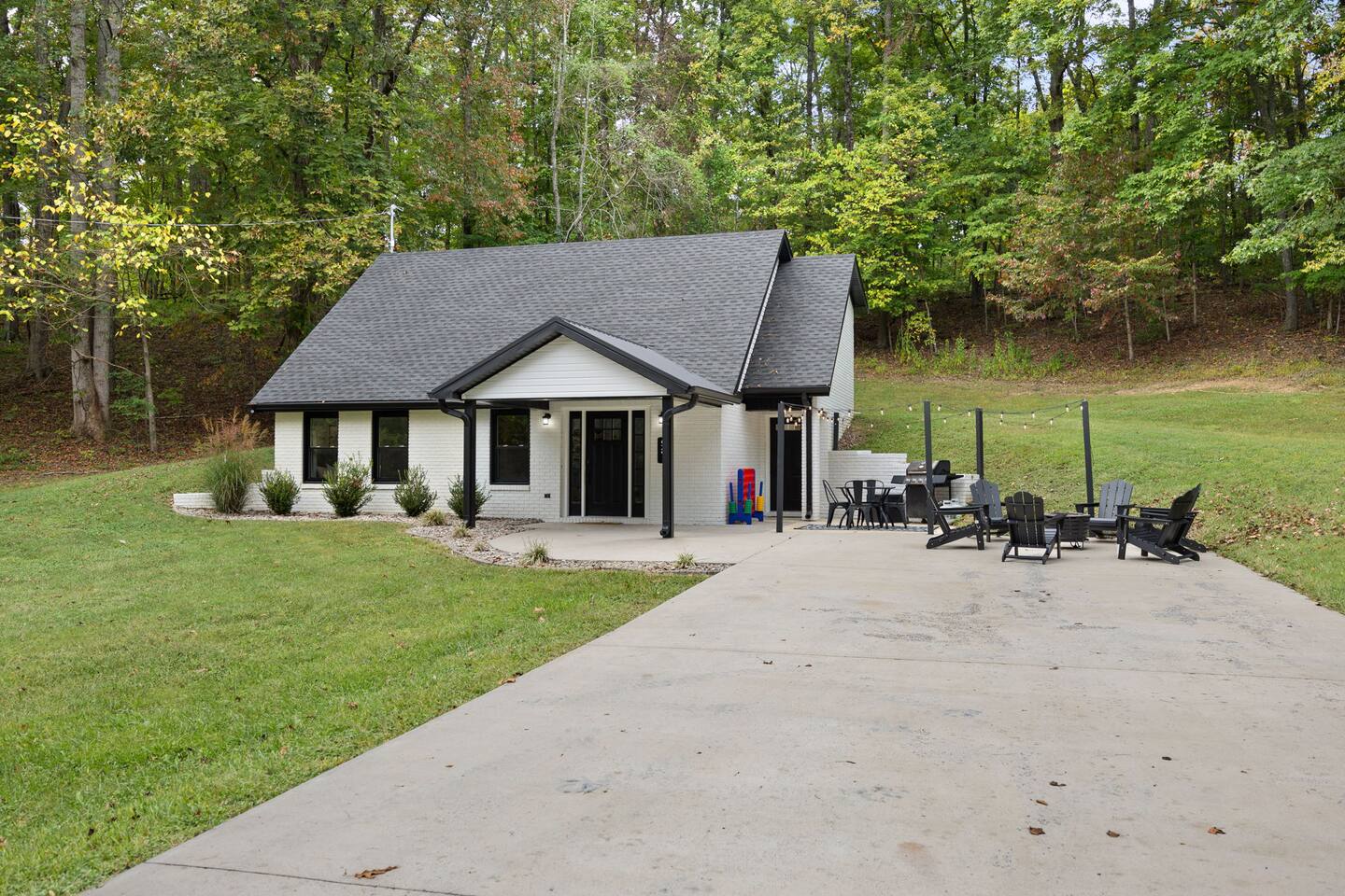 MAIN LEVEL: INDOOR LIVING: 70” Smart Roku TV, 1 sleeper sofa, dining table, 2 closets, ceiling fan, electric fireplace, mini-split system with remote. LAUNDRY: The washer and dryer are in the closet, and there is a starter supply of laundry pods. KITCHEN: The fully stocked kitchen includes dishware, flatware, pots, pans, bakeware, glassware, and cooking utensils. Appliances include a Keurig and drip coffee maker, crockpot, griddle, hand mixer, toaster, blender, dishwasher, refrigerator with ice maker, glass-top range, and microwave. There is outside access to the patio/firepit area and a stairwell to the upstairs bedrooms. Also provided is a starter supply of coffee pods, sugar, creamer, tea, salt/pepper, oil, and dishwasher pods. BEDROOM 1: 70” Smart Roku TV, King Bed, nightstands, ceiling fan with a remote, mini-split system with a remote. BATHROOM 1: Full bathroom (Shower), basic toiletries (Closet is locked for host use). UPPER LEVEL: BEDROOM 2: 32” Smart Roku TV, 2 Twin Beds, closet, Wi-Fi router, ceiling fan with remote, mini-split system with remote. BEDROOM 3: 65” Smart Roku TV, Queen Bed, dresser and nightstand, closet, ceiling fan with remote, mini-split system with remote. BATHROOM 2: Full Bath (Shower/tub) GENERAL: Free WiFi, complimentary toiletries, hair dryer, towels and linens, washer and dryer, 4 mini split units, 4 Adirondack chairs, grill, fire pit, detached garage (not for guest use), Corn hole boards, outdoor connect-four yard game, Basketball goal. PARKING: Paved Driveway; parking for 4 or more vehicles outside the garage. Things to note: The house is located in a residential area. Please be considerate of residents and observe quiet hours from 9:30 PM to 8:00 AM. No pets or smoking allowed. Please treat the house as if it were your own. A starter supply of toilet tissue, paper towels, trash bags, dish soap, and laundry pods is provided. Extra linens, towels, blankets, and pillows can be found in the closets. Self-check-in is available via an electronic keypad lock, and a door code will be provided at least 24 hours before your arrival. **Wildlife and Bugs:** Being close to the lake/woods may result in encounters with wildlife and bugs. We have monthly pest control services, but it is advisable to keep windows and doors closed. Brooms and a vacuum, including a small vacuum for ladybugs, are available for your convenience. You may see squirrels, raccoons, bears, turkeys, snakes, deer, and other wildlife. Please exercise caution. Please be aware that the gas grill is located outside, making it difficult to clean between guests. Depending on how the previous guest left it, you may need to clean it before use.