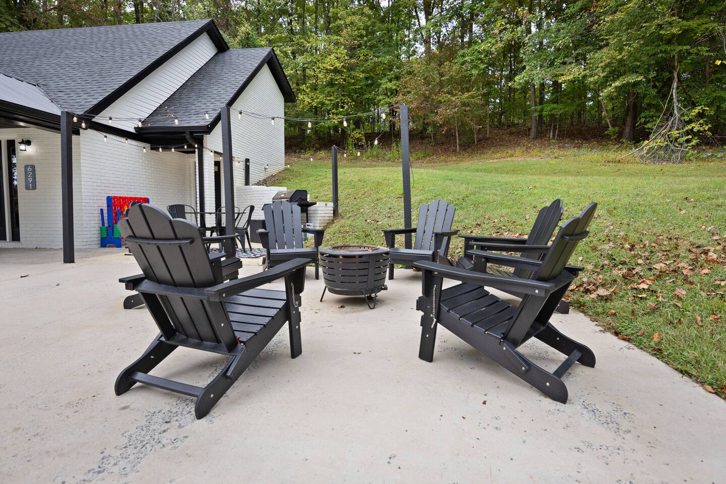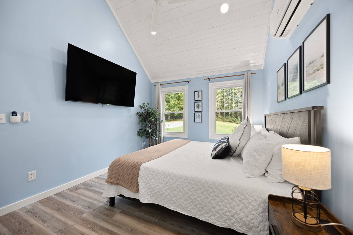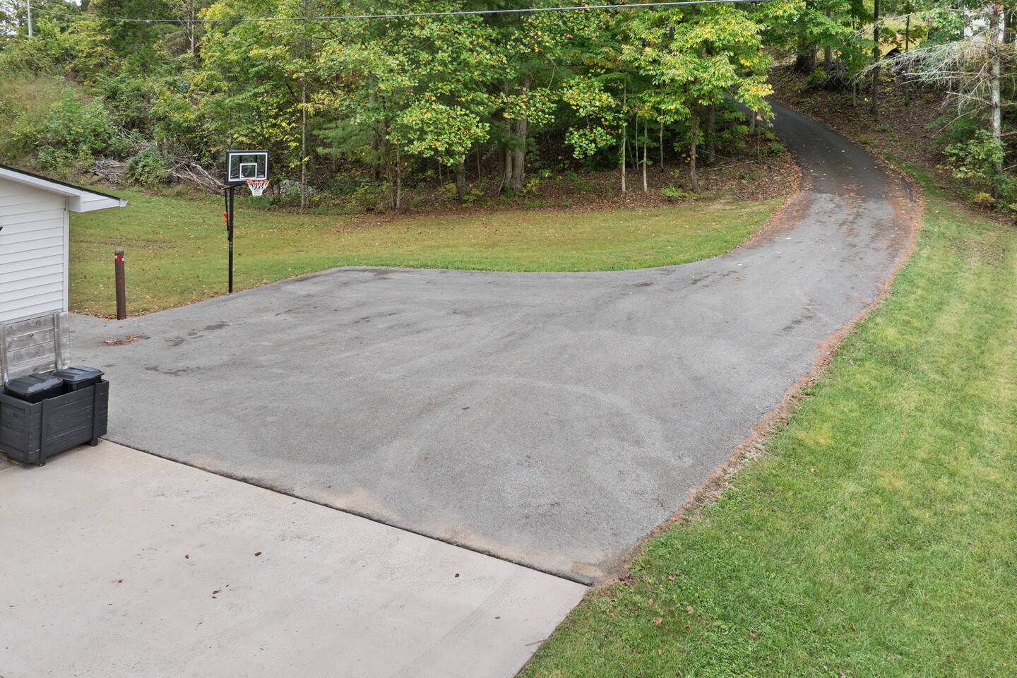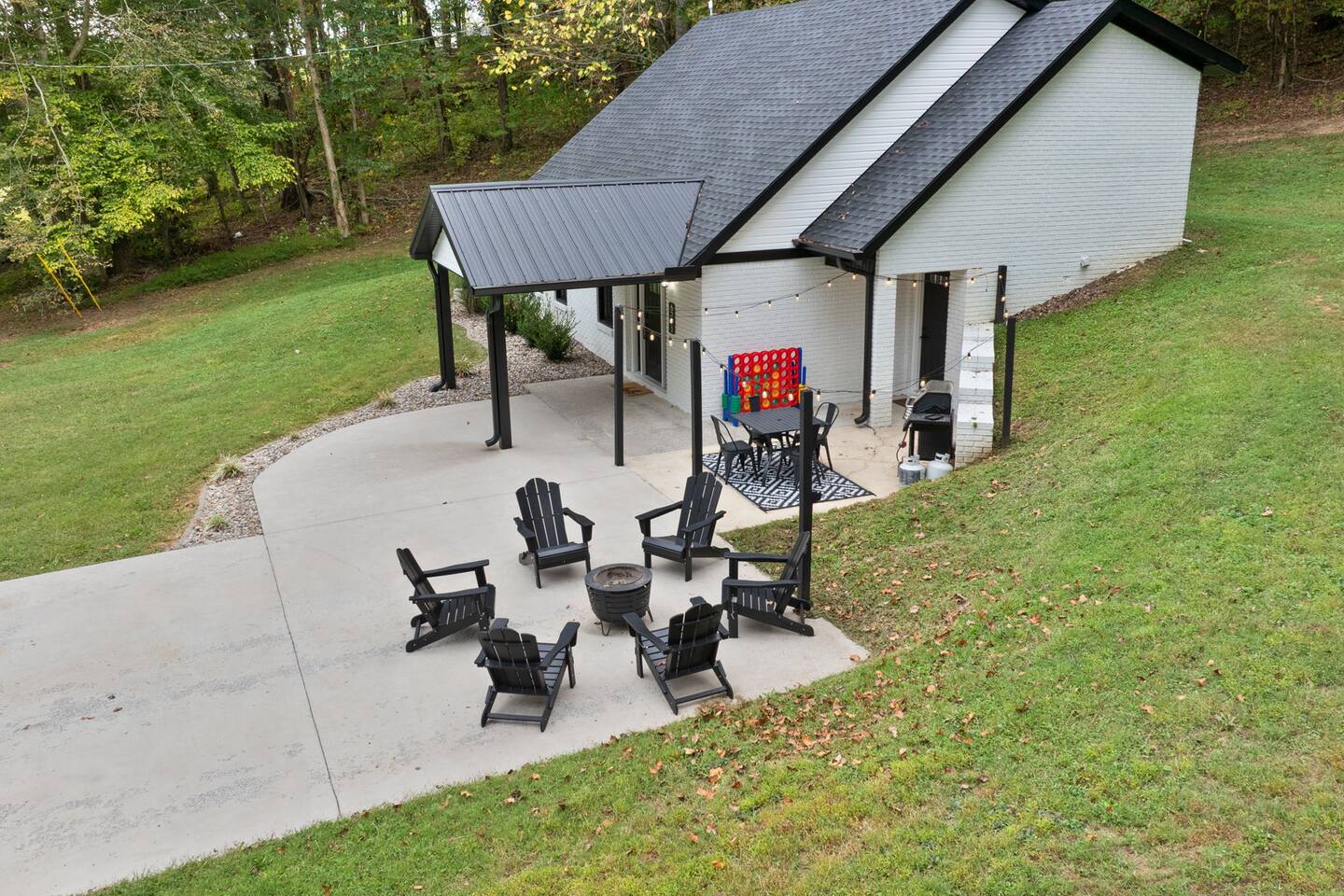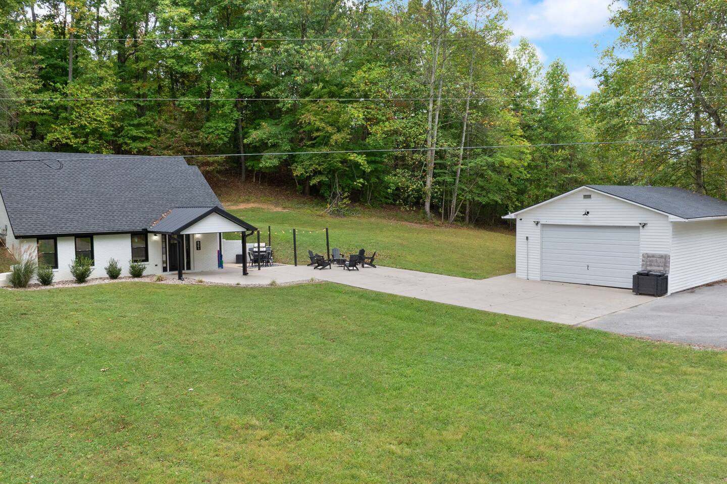 MAIN LEVEL: INDOOR LIVING: 70” Smart Roku TV, 1 sleeper sofa, dining table, 2 closets, ceiling fan, electric fireplace, mini-split system with remote. LAUNDRY: The washer and dryer are in the closet, and there is a starter supply of laundry pods. KITCHEN: The fully stocked kitchen includes dishware, flatware, pots, pans, bakeware, glassware, and cooking utensils. Appliances include a Keurig and drip coffee maker, crockpot, griddle, hand mixer, toaster, blender, dishwasher, refrigerator with ice maker, glass-top range, and microwave. There is outside access to the patio/firepit area and a stairwell to the upstairs bedrooms. Also provided is a starter supply of coffee pods, sugar, creamer, tea, salt/pepper, oil, and dishwasher pods. BEDROOM 1: 70” Smart Roku TV, King Bed, nightstands, ceiling fan with a remote, mini-split system with a remote. BATHROOM 1: Full bathroom (Shower), basic toiletries (Closet is locked for host use). UPPER LEVEL: BEDROOM 2: 32” Smart Roku TV, 2 Twin Beds, closet, Wi-Fi router, ceiling fan with remote, mini-split system with remote. BEDROOM 3: 65” Smart Roku TV, Queen Bed, dresser and nightstand, closet, ceiling fan with remote, mini-split system with remote. BATHROOM 2: Full Bath (Shower/tub) GENERAL: Free WiFi, complimentary toiletries, hair dryer, towels and linens, washer and dryer, 4 mini split units, 4 Adirondack chairs, grill, fire pit, detached garage (not for guest use), Corn hole boards, outdoor connect-four yard game, Basketball goal. PARKING: Paved Driveway; parking for 4 or more vehicles outside the garage. Things to note: The house is located in a residential area. Please be considerate of residents and observe quiet hours from 9:30 PM to 8:00 AM. No pets or smoking allowed. Please treat the house as if it were your own. A starter supply of toilet tissue, paper towels, trash bags, dish soap, and laundry pods is provided. Extra linens, towels, blankets, and pillows can be found in the closets. Self-check-in is available via an electronic keypad lock, and a door code will be provided at least 24 hours before your arrival. **Wildlife and Bugs:** Being close to the lake/woods may result in encounters with wildlife and bugs. We have monthly pest control services, but it is advisable to keep windows and doors closed. Brooms and a vacuum, including a small vacuum for ladybugs, are available for your convenience. You may see squirrels, raccoons, bears, turkeys, snakes, deer, and other wildlife. Please exercise caution. Please be aware that the gas grill is located outside, making it difficult to clean between guests. Depending on how the previous guest left it, you may need to clean it before use.