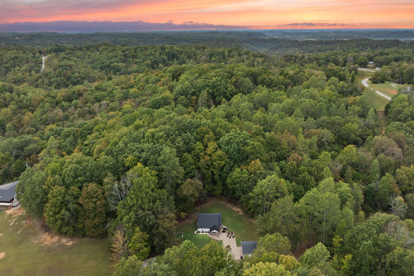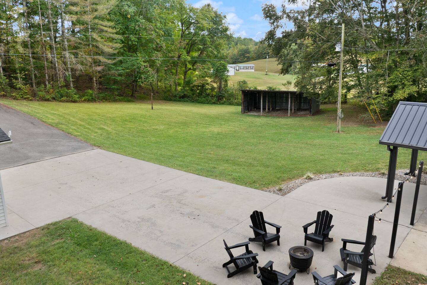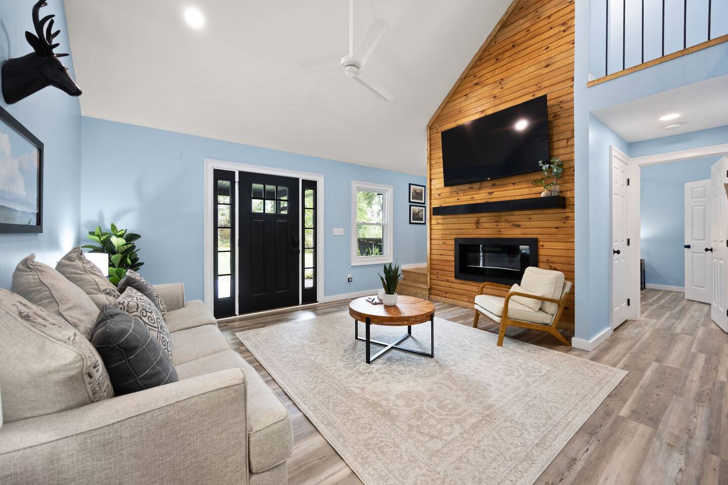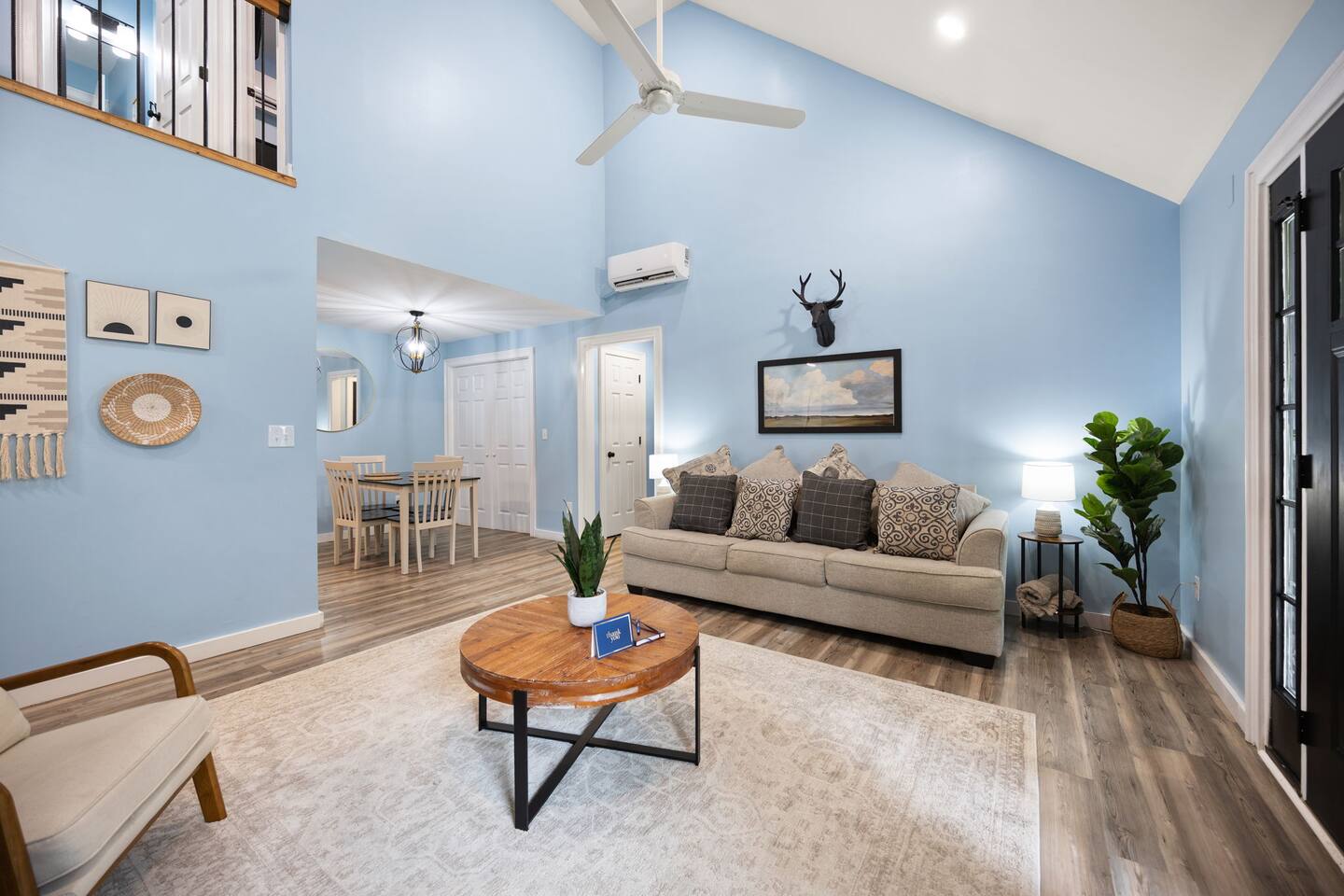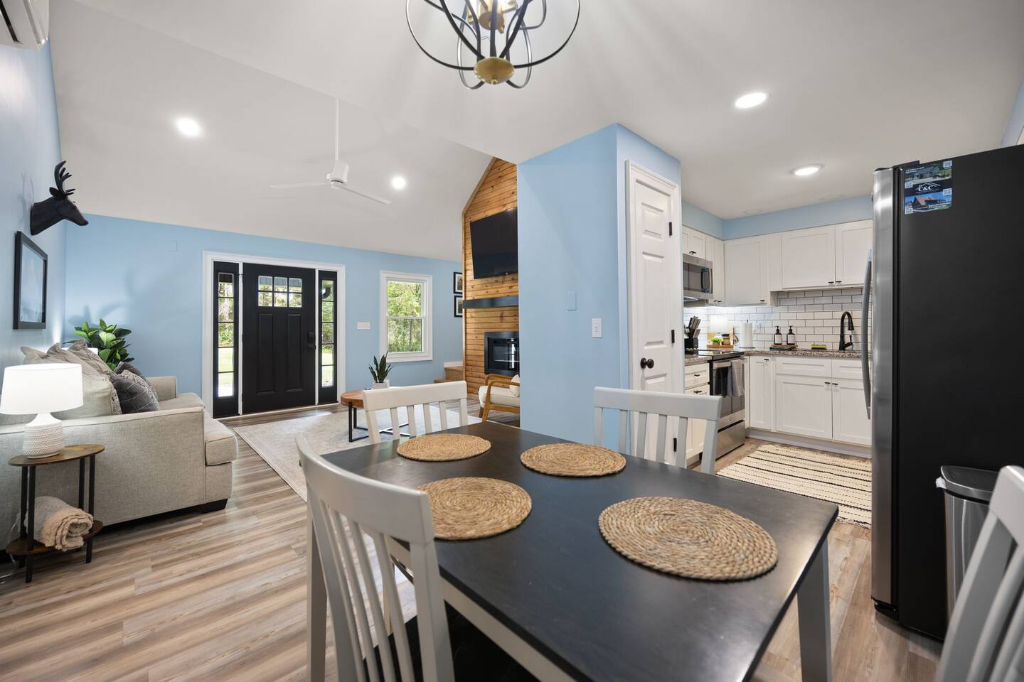 MAIN LEVEL: INDOOR LIVING: 70” Smart Roku TV, 1 sleeper sofa, dining table, 2 closets, ceiling fan, electric fireplace, mini-split system with remote. LAUNDRY: The washer and dryer are in the closet, and there is a starter supply of laundry pods. KITCHEN: The fully stocked kitchen includes dishware, flatware, pots, pans, bakeware, glassware, and cooking utensils. Appliances include a Keurig and drip coffee maker, crockpot, griddle, hand mixer, toaster, blender, dishwasher, refrigerator with ice maker, glass-top range, and microwave. There is outside access to the patio/firepit area and a stairwell to the upstairs bedrooms. Also provided is a starter supply of coffee pods, sugar, creamer, tea, salt/pepper, oil, and dishwasher pods. BEDROOM 1: 70” Smart Roku TV, King Bed, nightstands, ceiling fan with a remote, mini-split system with a remote. BATHROOM 1: Full bathroom (Shower), basic toiletries (Closet is locked for host use). UPPER LEVEL: BEDROOM 2: 32” Smart Roku TV, 2 Twin Beds, closet, Wi-Fi router, ceiling fan with remote, mini-split system with remote. BEDROOM 3: 65” Smart Roku TV, Queen Bed, dresser and nightstand, closet, ceiling fan with remote, mini-split system with remote. BATHROOM 2: Full Bath (Shower/tub) GENERAL: Free WiFi, complimentary toiletries, hair dryer, towels and linens, washer and dryer, 4 mini split units, 4 Adirondack chairs, grill, fire pit, detached garage (not for guest use), Corn hole boards, outdoor connect-four yard game, Basketball goal. PARKING: Paved Driveway; parking for 4 or more vehicles outside the garage. Things to note: The house is located in a residential area. Please be considerate of residents and observe quiet hours from 9:30 PM to 8:00 AM. No pets or smoking allowed. Please treat the house as if it were your own. A starter supply of toilet tissue, paper towels, trash bags, dish soap, and laundry pods is provided. Extra linens, towels, blankets, and pillows can be found in the closets. Self-check-in is available via an electronic keypad lock, and a door code will be provided at least 24 hours before your arrival. **Wildlife and Bugs:** Being close to the lake/woods may result in encounters with wildlife and bugs. We have monthly pest control services, but it is advisable to keep windows and doors closed. Brooms and a vacuum, including a small vacuum for ladybugs, are available for your convenience. You may see squirrels, raccoons, bears, turkeys, snakes, deer, and other wildlife. Please exercise caution. Please be aware that the gas grill is located outside, making it difficult to clean between guests. Depending on how the previous guest left it, you may need to clean it before use.