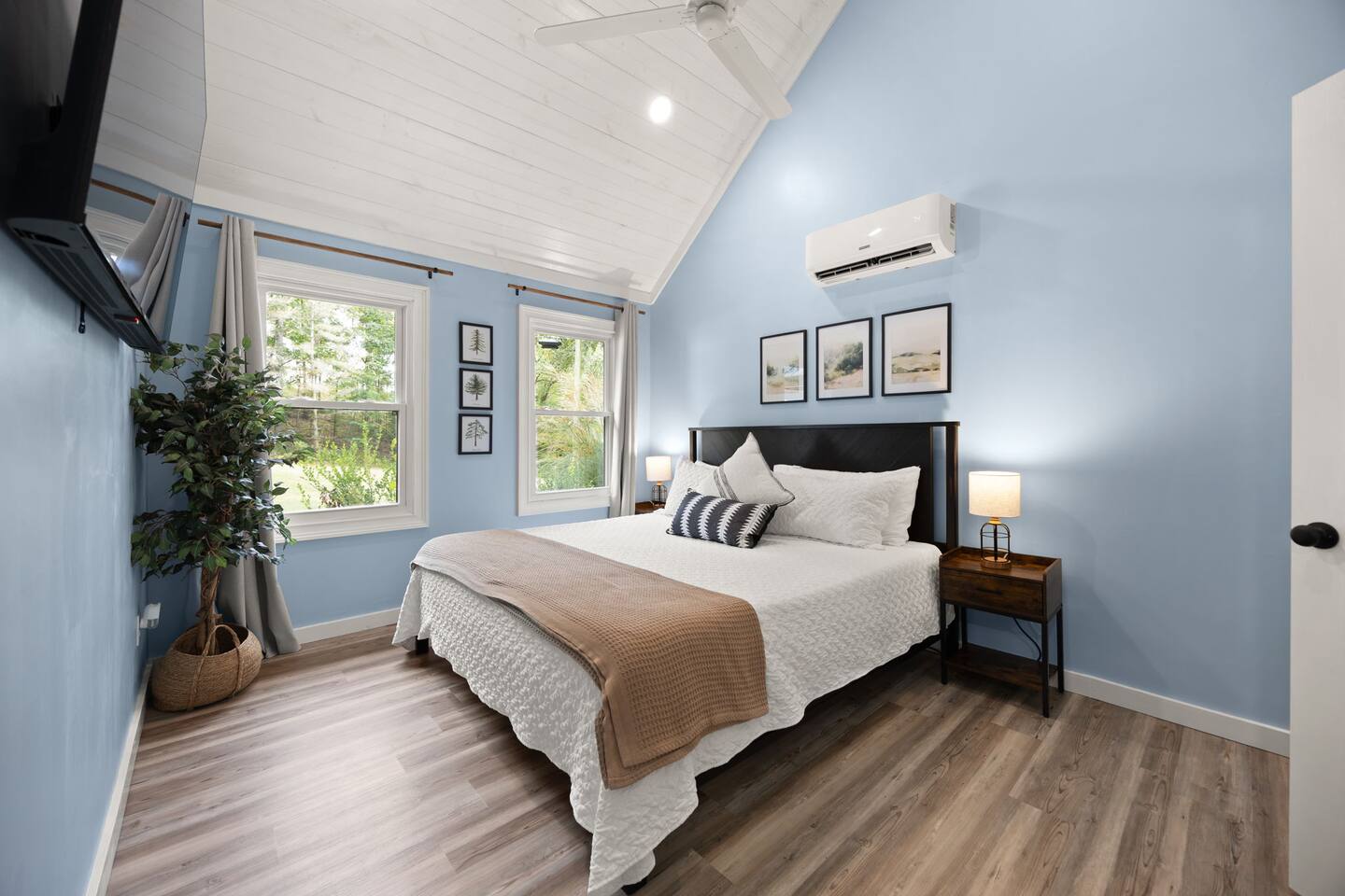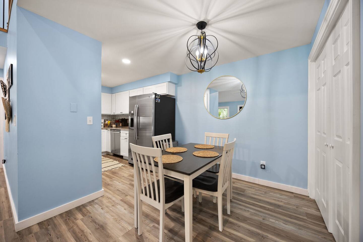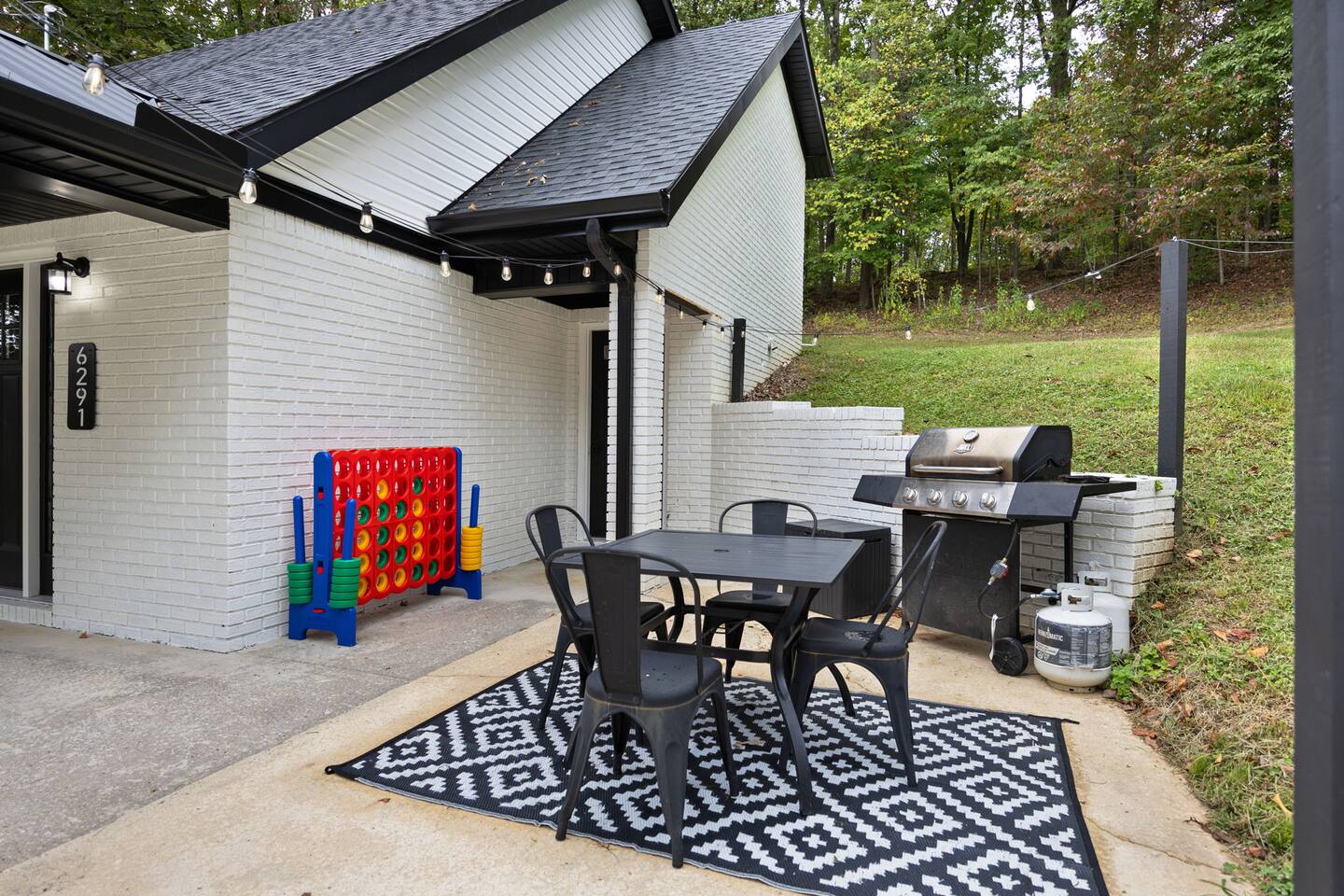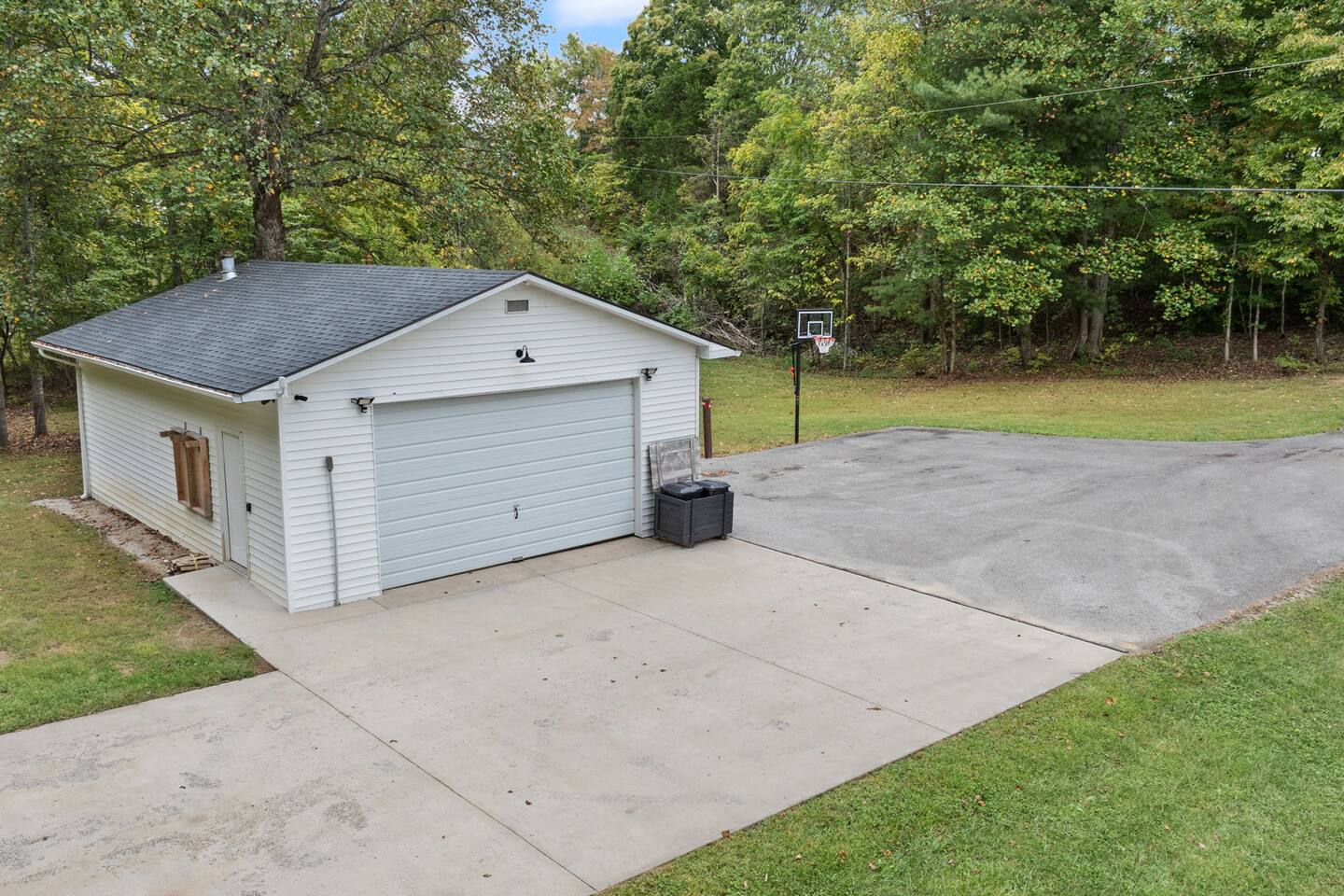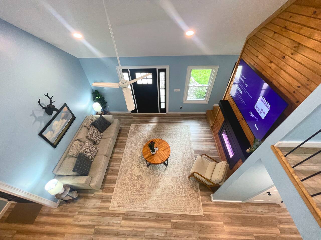 MAIN LEVEL: INDOOR LIVING: 70” Smart Roku TV, 1 sleeper sofa, dining table, 2 closets, ceiling fan, electric fireplace, mini-split system with remote. LAUNDRY: The washer and dryer are in the closet, and there is a starter supply of laundry pods. KITCHEN: The fully stocked kitchen includes dishware, flatware, pots, pans, bakeware, glassware, and cooking utensils. Appliances include a Keurig and drip coffee maker, crockpot, griddle, hand mixer, toaster, blender, dishwasher, refrigerator with ice maker, glass-top range, and microwave. There is outside access to the patio/firepit area and a stairwell to the upstairs bedrooms. Also provided is a starter supply of coffee pods, sugar, creamer, tea, salt/pepper, oil, and dishwasher pods. BEDROOM 1: 70” Smart Roku TV, King Bed, nightstands, ceiling fan with a remote, mini-split system with a remote. BATHROOM 1: Full bathroom (Shower), basic toiletries (Closet is locked for host use). UPPER LEVEL: BEDROOM 2: 32” Smart Roku TV, 2 Twin Beds, closet, Wi-Fi router, ceiling fan with remote, mini-split system with remote. BEDROOM 3: 65” Smart Roku TV, Queen Bed, dresser and nightstand, closet, ceiling fan with remote, mini-split system with remote. BATHROOM 2: Full Bath (Shower/tub) GENERAL: Free WiFi, complimentary toiletries, hair dryer, towels and linens, washer and dryer, 4 mini split units, 4 Adirondack chairs, grill, fire pit, detached garage (not for guest use), Corn hole boards, outdoor connect-four yard game, Basketball goal. PARKING: Paved Driveway; parking for 4 or more vehicles outside the garage. Things to note: The house is located in a residential area. Please be considerate of residents and observe quiet hours from 9:30 PM to 8:00 AM. No pets or smoking allowed. Please treat the house as if it were your own. A starter supply of toilet tissue, paper towels, trash bags, dish soap, and laundry pods is provided. Extra linens, towels, blankets, and pillows can be found in the closets. Self-check-in is available via an electronic keypad lock, and a door code will be provided at least 24 hours before your arrival. **Wildlife and Bugs:** Being close to the lake/woods may result in encounters with wildlife and bugs. We have monthly pest control services, but it is advisable to keep windows and doors closed. Brooms and a vacuum, including a small vacuum for ladybugs, are available for your convenience. You may see squirrels, raccoons, bears, turkeys, snakes, deer, and other wildlife. Please exercise caution. Please be aware that the gas grill is located outside, making it difficult to clean between guests. Depending on how the previous guest left it, you may need to clean it before use.