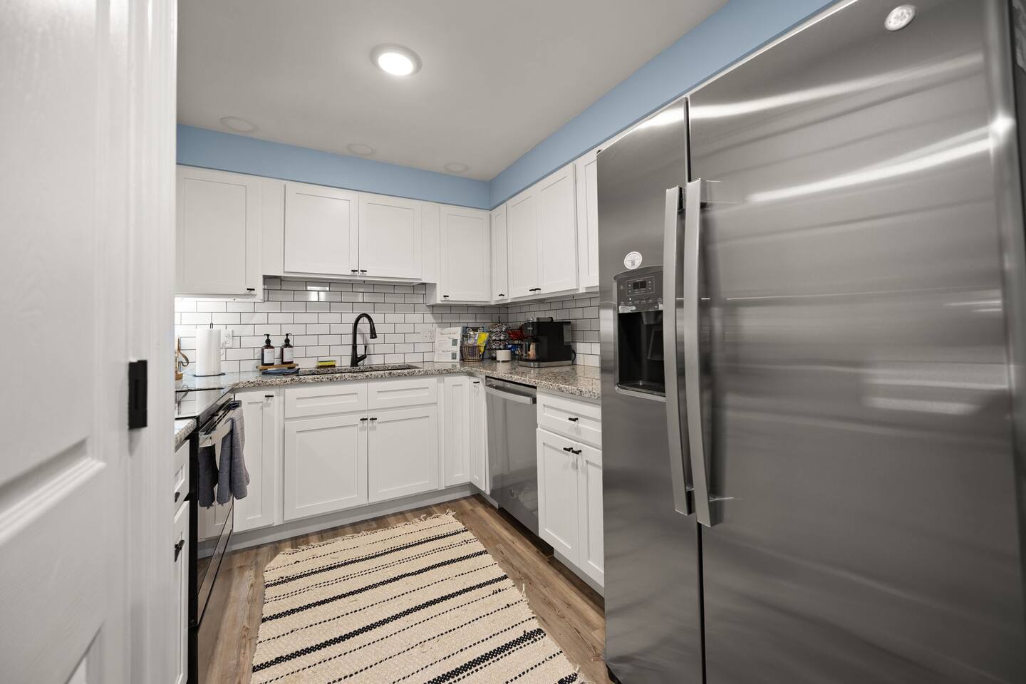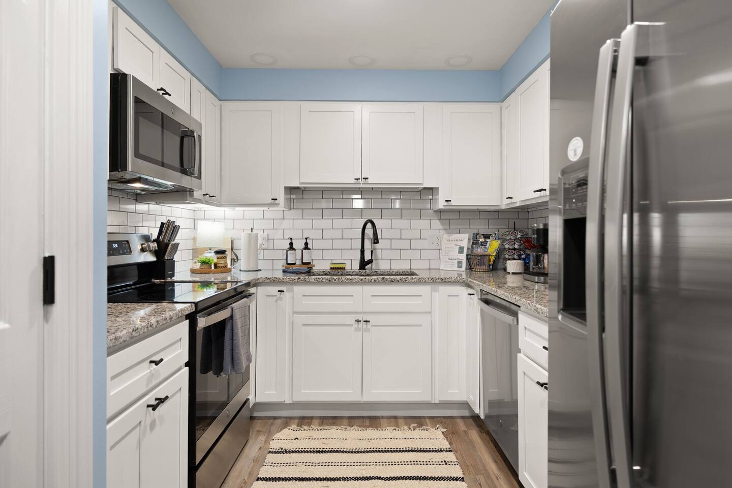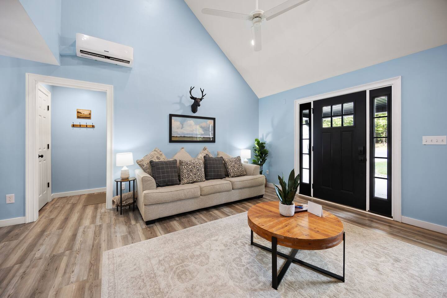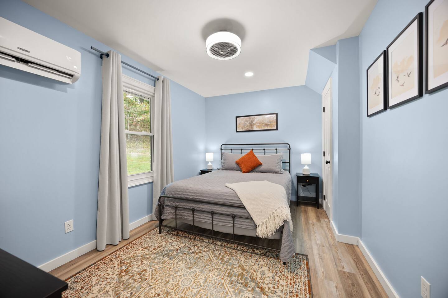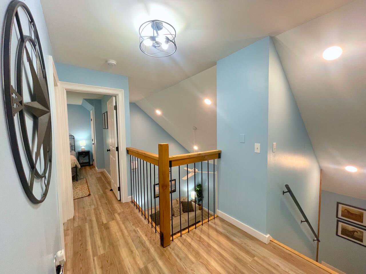 MAIN LEVEL: INDOOR LIVING: 70” Smart Roku TV, 1 sleeper sofa, dining table, 2 closets, ceiling fan, electric fireplace, mini-split system with remote. LAUNDRY: The washer and dryer are in the closet, and there is a starter supply of laundry pods. KITCHEN: The fully stocked kitchen includes dishware, flatware, pots, pans, bakeware, glassware, and cooking utensils. Appliances include a Keurig and drip coffee maker, crockpot, griddle, hand mixer, toaster, blender, dishwasher, refrigerator with ice maker, glass-top range, and microwave. There is outside access to the patio/firepit area and a stairwell to the upstairs bedrooms. Also provided is a starter supply of coffee pods, sugar, creamer, tea, salt/pepper, oil, and dishwasher pods. BEDROOM 1: 70” Smart Roku TV, King Bed, nightstands, ceiling fan with a remote, mini-split system with a remote. BATHROOM 1: Full bathroom (Shower), basic toiletries (Closet is locked for host use). UPPER LEVEL: BEDROOM 2: 32” Smart Roku TV, 2 Twin Beds, closet, Wi-Fi router, ceiling fan with remote, mini-split system with remote. BEDROOM 3: 65” Smart Roku TV, Queen Bed, dresser and nightstand, closet, ceiling fan with remote, mini-split system with remote. BATHROOM 2: Full Bath (Shower/tub) GENERAL: Free WiFi, complimentary toiletries, hair dryer, towels and linens, washer and dryer, 4 mini split units, 4 Adirondack chairs, grill, fire pit, detached garage (not for guest use), Corn hole boards, outdoor connect-four yard game, Basketball goal. PARKING: Paved Driveway; parking for 4 or more vehicles outside the garage. Things to note: The house is located in a residential area. Please be considerate of residents and observe quiet hours from 9:30 PM to 8:00 AM. No pets or smoking allowed. Please treat the house as if it were your own. A starter supply of toilet tissue, paper towels, trash bags, dish soap, and laundry pods is provided. Extra linens, towels, blankets, and pillows can be found in the closets. Self-check-in is available via an electronic keypad lock, and a door code will be provided at least 24 hours before your arrival. **Wildlife and Bugs:** Being close to the lake/woods may result in encounters with wildlife and bugs. We have monthly pest control services, but it is advisable to keep windows and doors closed. Brooms and a vacuum, including a small vacuum for ladybugs, are available for your convenience. You may see squirrels, raccoons, bears, turkeys, snakes, deer, and other wildlife. Please exercise caution. Please be aware that the gas grill is located outside, making it difficult to clean between guests. Depending on how the previous guest left it, you may need to clean it before use.
