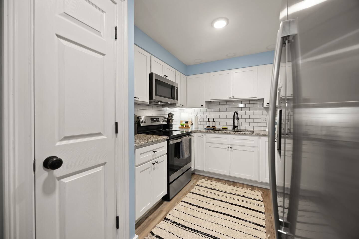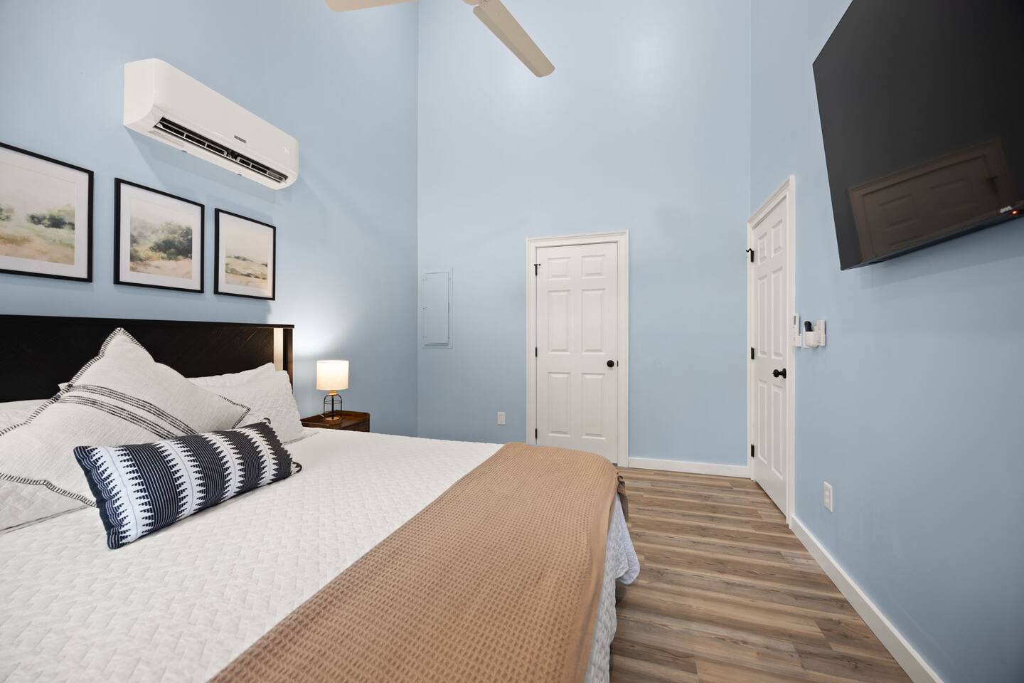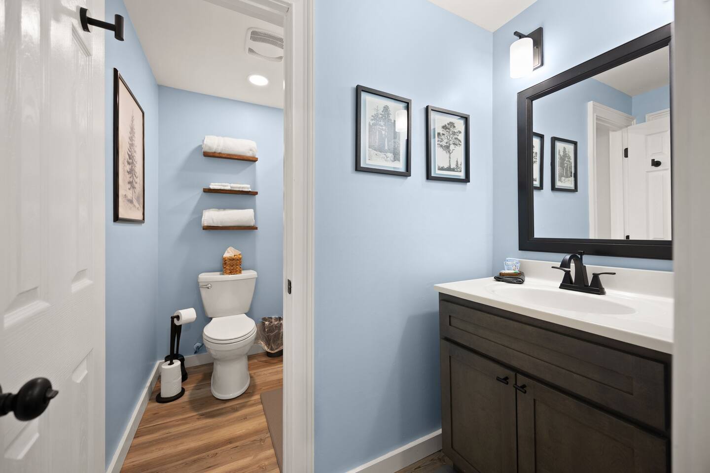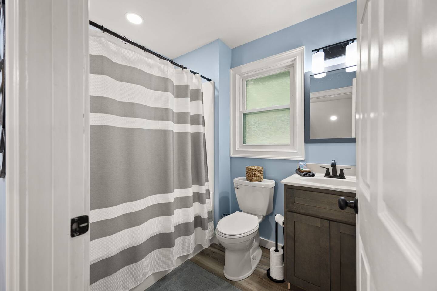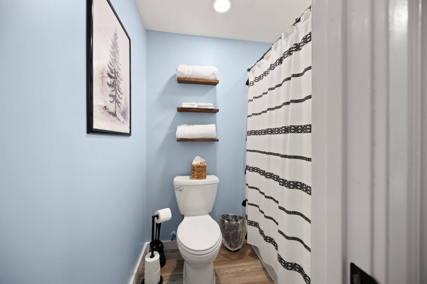 MAIN LEVEL: INDOOR LIVING: 70” Smart Roku TV, 1 sleeper sofa, dining table, 2 closets, ceiling fan, electric fireplace, mini-split system with remote. LAUNDRY: The washer and dryer are in the closet, and there is a starter supply of laundry pods. KITCHEN: The fully stocked kitchen includes dishware, flatware, pots, pans, bakeware, glassware, and cooking utensils. Appliances include a Keurig and drip coffee maker, crockpot, griddle, hand mixer, toaster, blender, dishwasher, refrigerator with ice maker, glass-top range, and microwave. There is outside access to the patio/firepit area and a stairwell to the upstairs bedrooms. Also provided is a starter supply of coffee pods, sugar, creamer, tea, salt/pepper, oil, and dishwasher pods. BEDROOM 1: 70” Smart Roku TV, King Bed, nightstands, ceiling fan with a remote, mini-split system with a remote. BATHROOM 1: Full bathroom (Shower), basic toiletries (Closet is locked for host use). UPPER LEVEL: BEDROOM 2: 32” Smart Roku TV, 2 Twin Beds, closet, Wi-Fi router, ceiling fan with remote, mini-split system with remote. BEDROOM 3: 65” Smart Roku TV, Queen Bed, dresser and nightstand, closet, ceiling fan with remote, mini-split system with remote. BATHROOM 2: Full Bath (Shower/tub) GENERAL: Free WiFi, complimentary toiletries, hair dryer, towels and linens, washer and dryer, 4 mini split units, 4 Adirondack chairs, grill, fire pit, detached garage (not for guest use), Corn hole boards, outdoor connect-four yard game, Basketball goal. PARKING: Paved Driveway; parking for 4 or more vehicles outside the garage. Things to note: The house is located in a residential area. Please be considerate of residents and observe quiet hours from 9:30 PM to 8:00 AM. No pets or smoking allowed. Please treat the house as if it were your own. A starter supply of toilet tissue, paper towels, trash bags, dish soap, and laundry pods is provided. Extra linens, towels, blankets, and pillows can be found in the closets. Self-check-in is available via an electronic keypad lock, and a door code will be provided at least 24 hours before your arrival. **Wildlife and Bugs:** Being close to the lake/woods may result in encounters with wildlife and bugs. We have monthly pest control services, but it is advisable to keep windows and doors closed. Brooms and a vacuum, including a small vacuum for ladybugs, are available for your convenience. You may see squirrels, raccoons, bears, turkeys, snakes, deer, and other wildlife. Please exercise caution. Please be aware that the gas grill is located outside, making it difficult to clean between guests. Depending on how the previous guest left it, you may need to clean it before use.